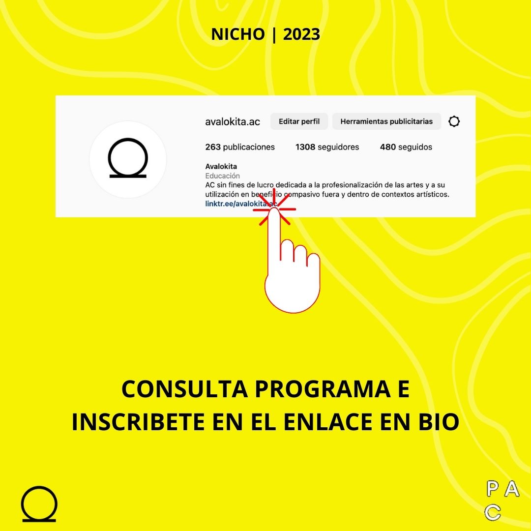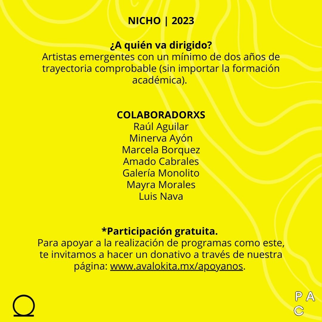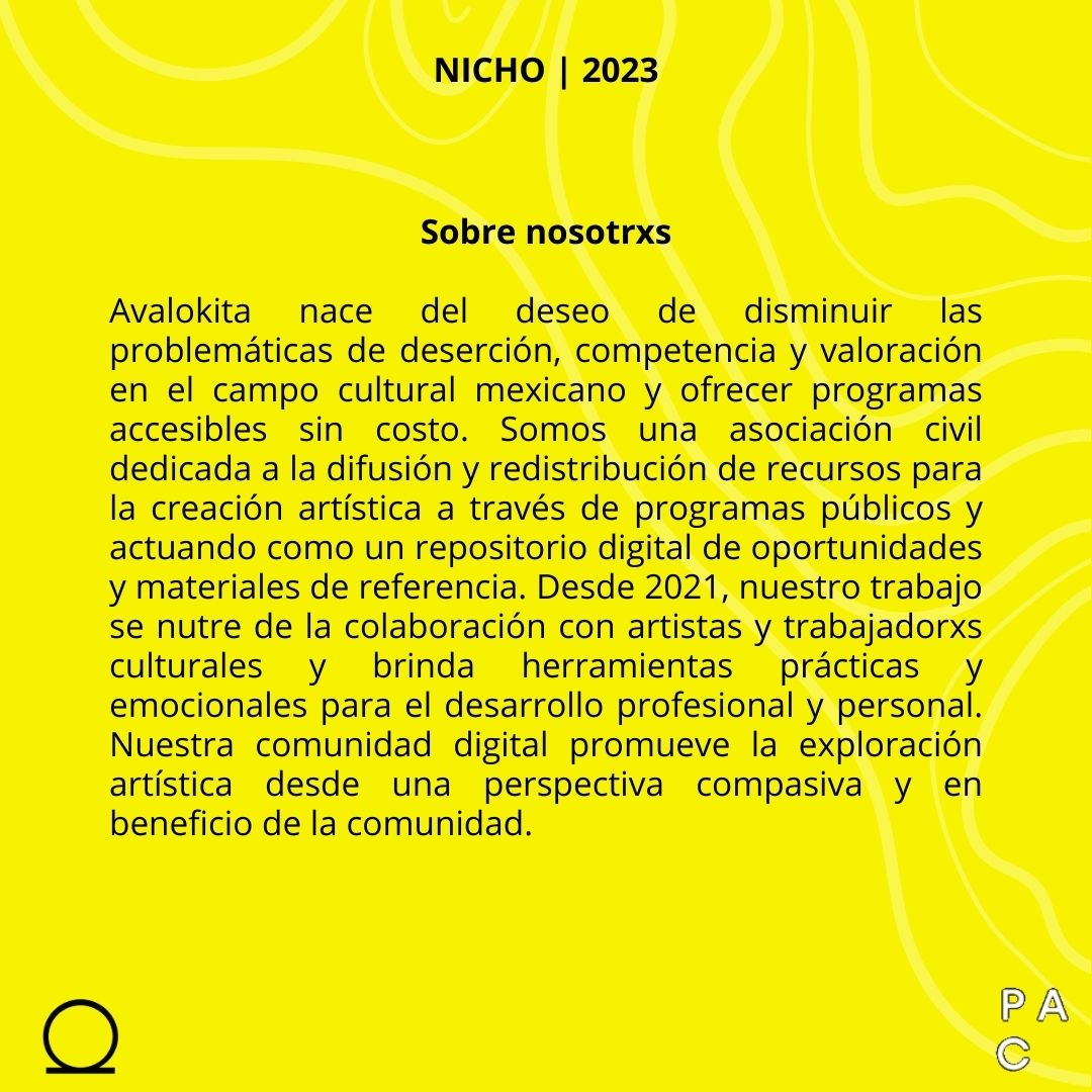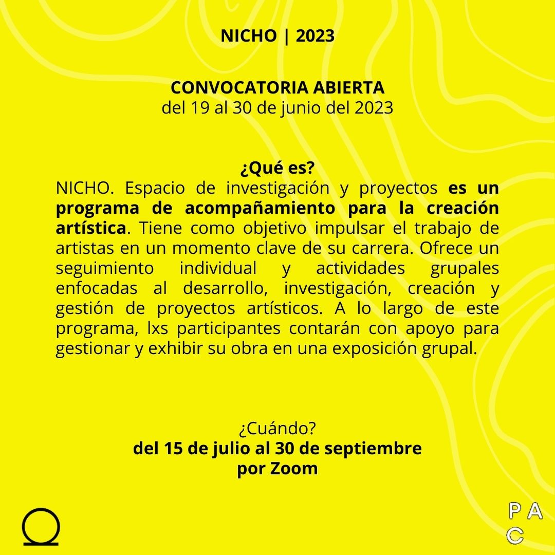 Nicho. Espacio de investigación y proyectos es un programa de acompañamiento para la creación artística. Tiene como objetivo impulsar el trabajo de artistas en un momento clave de su carrera. Ofrece un seguimiento individual y actividades grupales enfocadas al desarrollo, investigación, creación y gestión de proyectos artísticos. Durante las sesiones individuales, lxs tutorxs asignadxs de acuerdo a los perfiles de lxs participantes, harán seguimiento de su producción con base en sus objetivos y necesidades específicas.