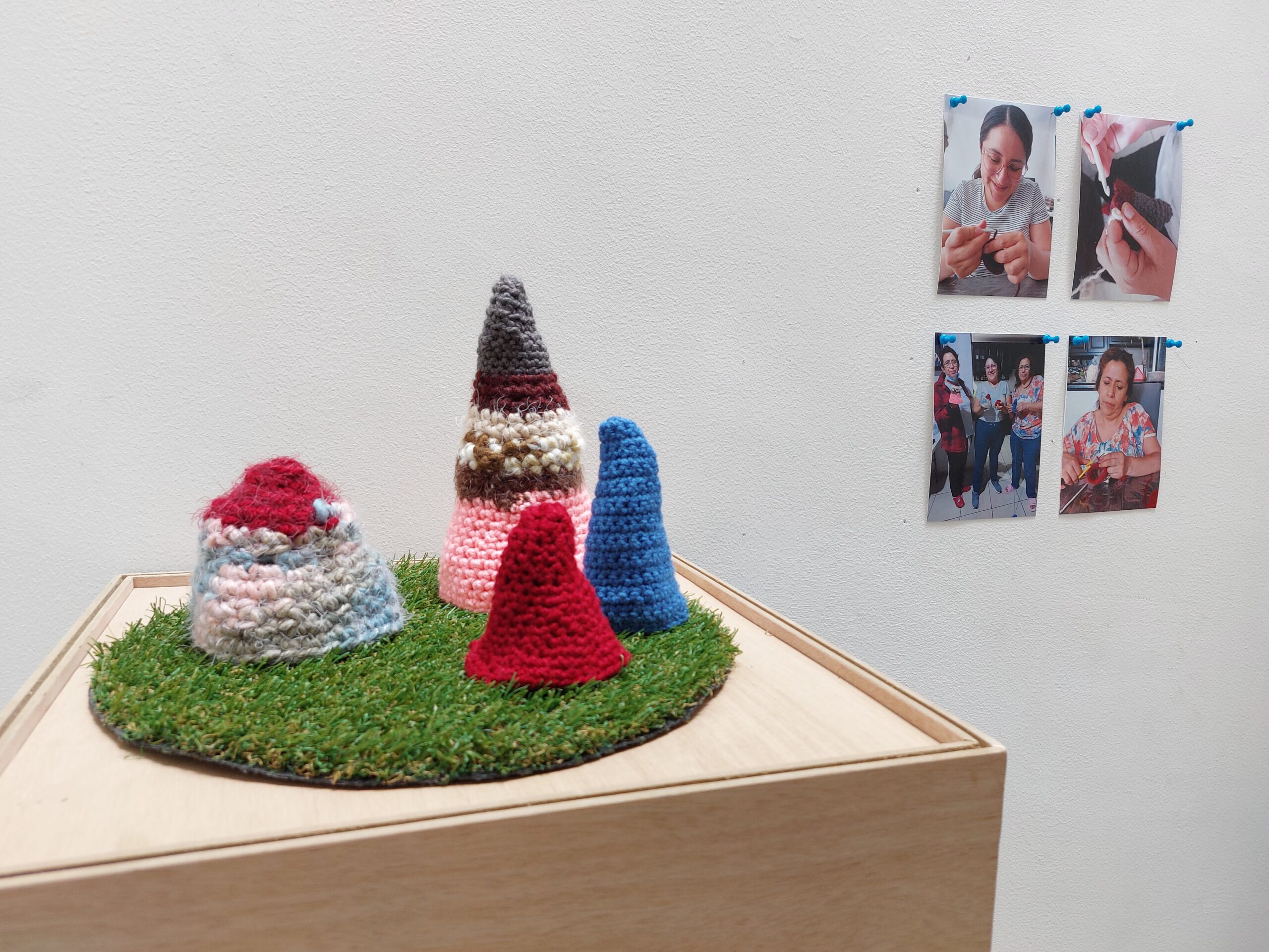 “Tejer el paisaje” se basa en una intervención comunitaria que involucra a mujeres víctimas de violencia de género residentes de los barrios altos de la zona centro en la ciudad de Pachuca. Su objetivo es la creación de un dispositivo estético a partir del tejido colectivo de un paisaje bidimensional a gran formato, donde cada mujer es encargada de tejer su propia montaña para después ser integrada a una composición final. Aquí el paisaje es una estrategia visual y metafórica para abordar el problema de violencia de género que existe en la zona, la cual es percibida de manera negativa provocando que las habitantes sufran de estigmatización territorial y se les dificulte aún más, acceder a programas institucionales que atiendan la violencia de género en la zona. Ante este escenario, el proyecto propone conformar un espacio donde el ejercicio creativo a través del tejido contribuya a generar vínculos de diálogo y apoyo entre aquellas mujeres que han sido víctimas de violencia de género en estos barrios. Tejer un paisaje es tejer una comunidad donde se vean reflejadas a sí mismas como parte importante y en la que puedan apoyarse y apoyar a otras.